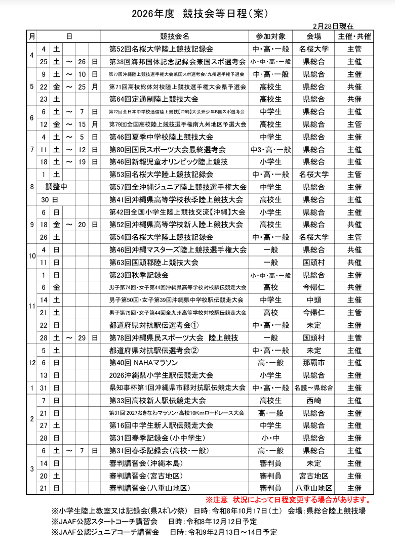 news 春季記録会(小・中)に参加! 2026.02.22 yano 2026年2月22日(日) 県総合運動公園で春季記録会(小・中)が開催されました。 沖縄は日本全国の中で一番早いトラック&フィールドのシーズンインを迎えます。(暖かいので) 小学生低学年のレースから順次スタート。ウォー…